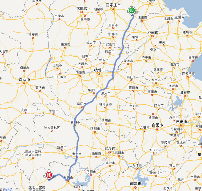 左右,沿途經過衡水——濮陽——許昌——平頂山——南陽——襄陽——荊門——荊州——常德——慈利——張家界。